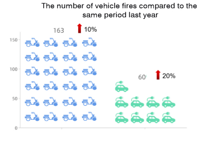 Theo số liệu từ Sở Phòng cháy chữa cháy Quảng Đông, đã có 163 vụ cháy xe đạp điện. trong quý đầu tiên của năm 2022 một năm sau tăng 10% mỗi năm và 60 vụ cháy xe điện hoặc xe hybrid, tăng 20% so với cùng kỳ năm ngoái.